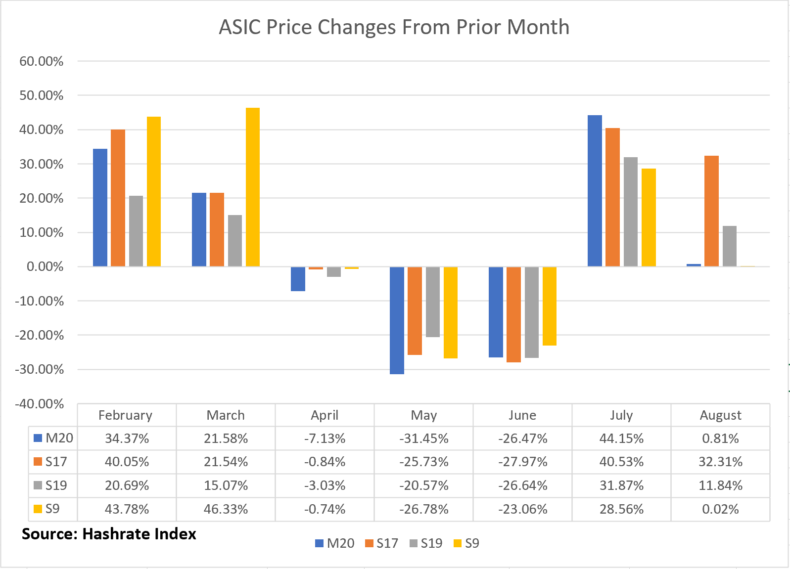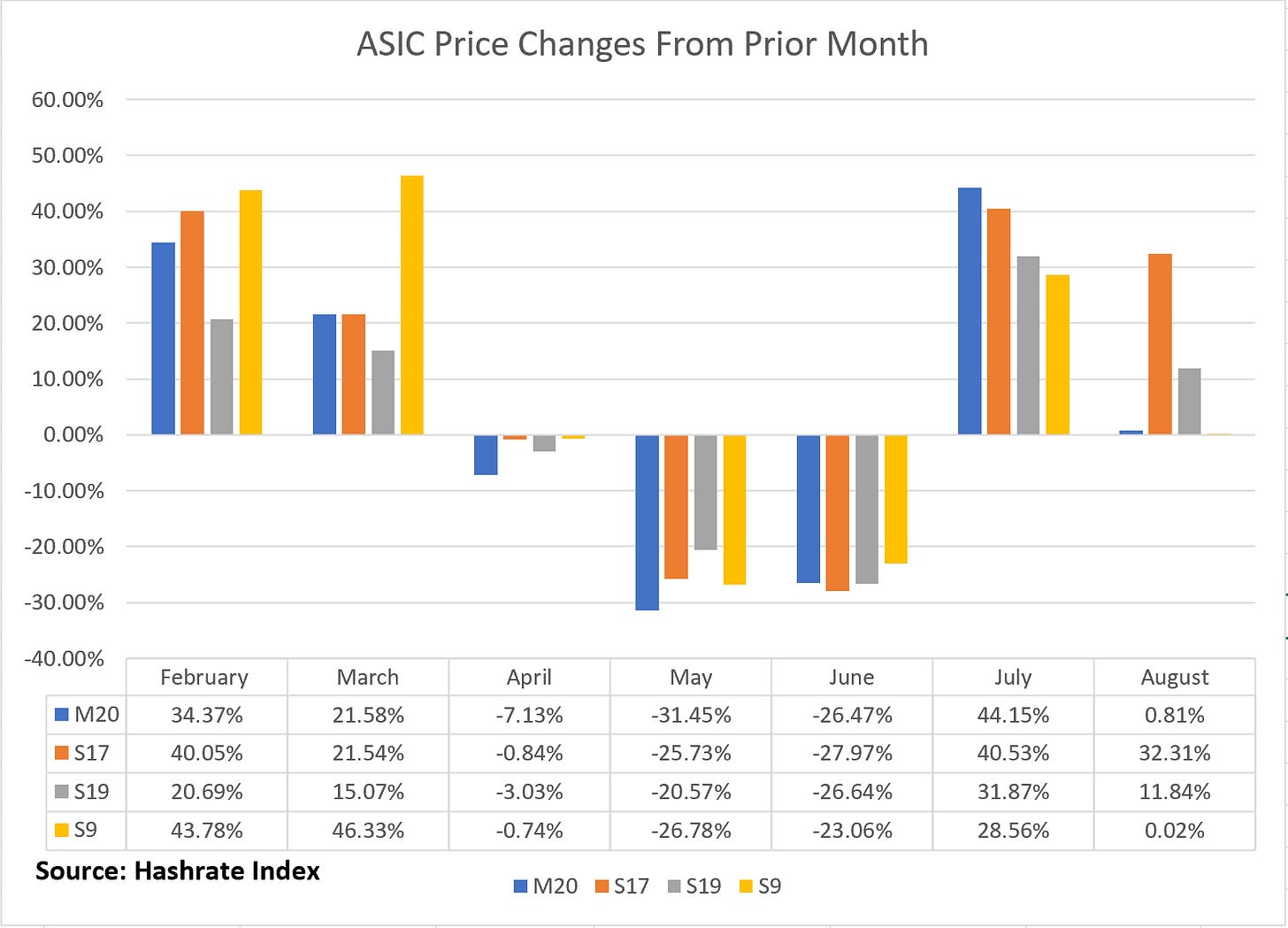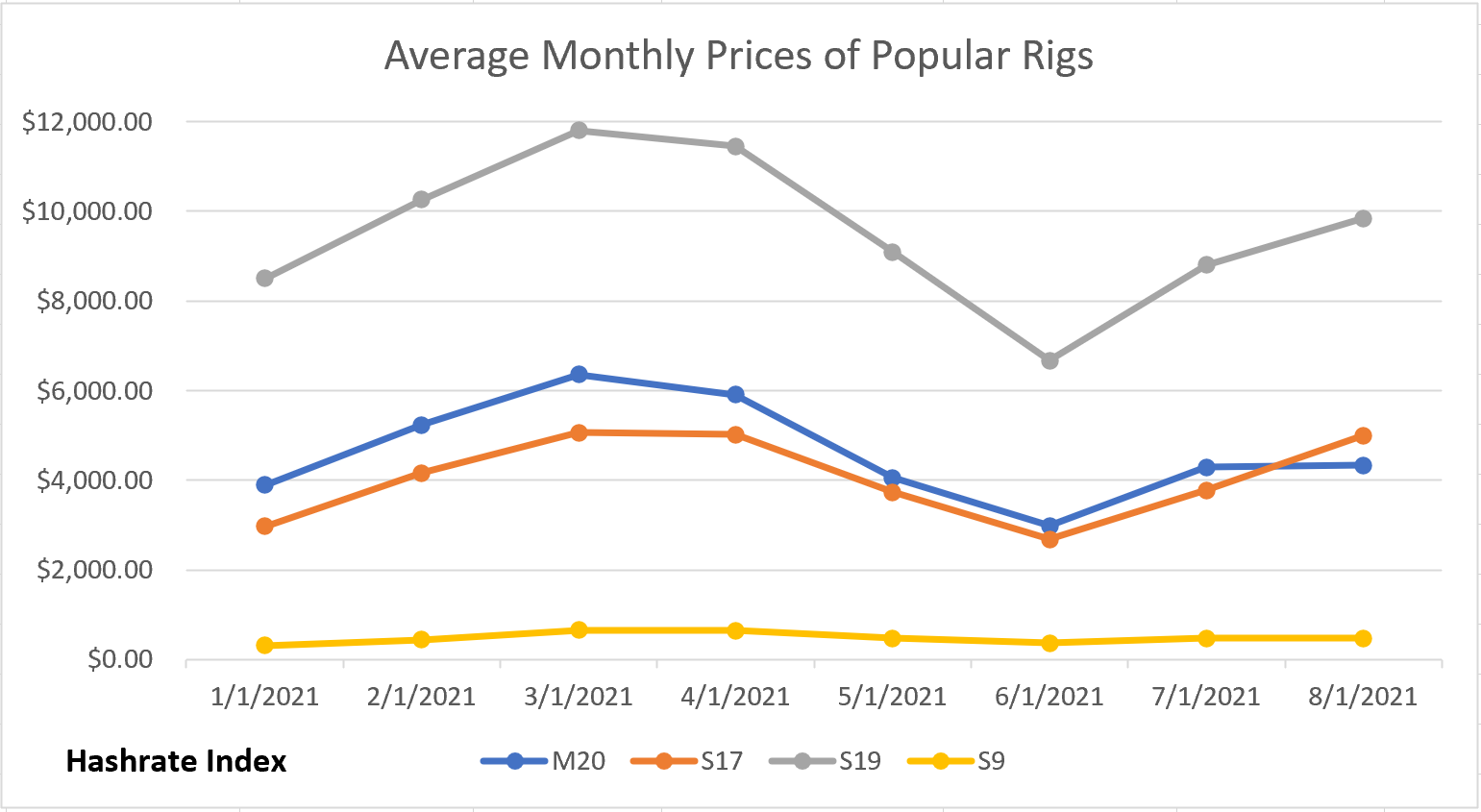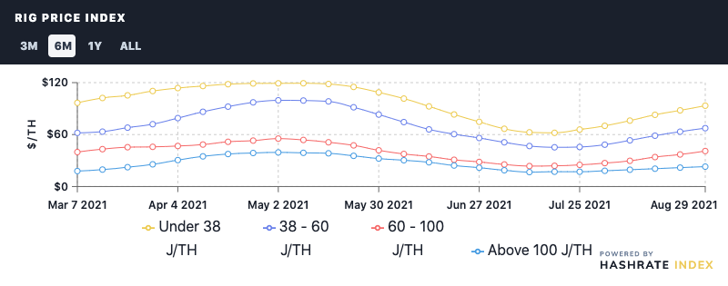 We also updated our Popular Rigs Price index this week and noticed something interesting: the average price in August for older generation machines, like the S9 and M20, didn’t budge by any notable degree, while prices for rigs like the S19 and even mid gen ones like the S17 moved considerably.